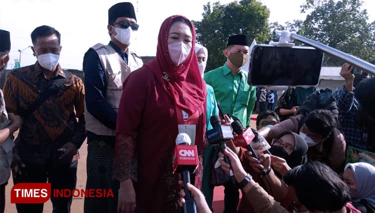 TIMES Karawang/Putri Abdurrahman Wahid (Gus Dur) Yeny Wahid saat diwawancarai oleh awak media. (FOTO: Moh Ramli/TIMES Indonesia)
